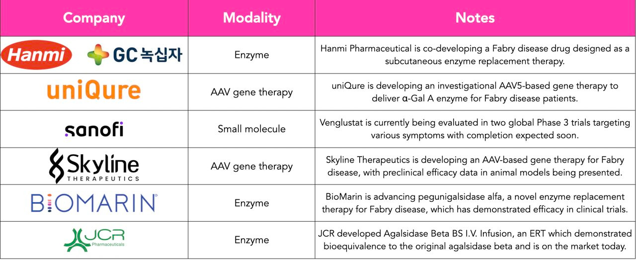 Historically, Fabry R&D has centered on enzyme replacement therapies (ERTs) and molecular chaperones, with commercial successes from Sanofi, Chiesi Group, and others in the space.